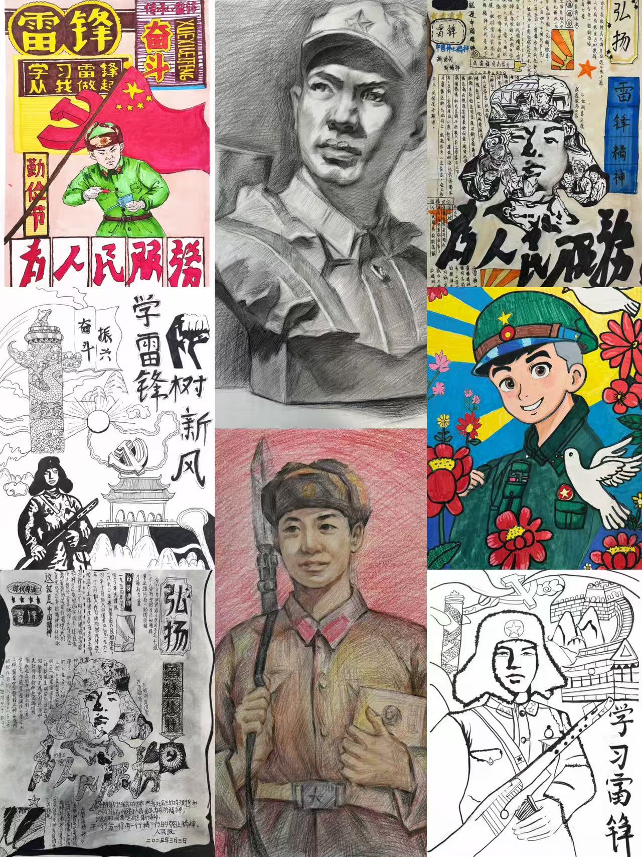 美術(shù)組發(fā)起的“鋒行畫卷”主題創(chuàng)作大賽,圍繞“雷鋒故事”“身邊微光”“公益行動”三大方向,激發(fā)學(xué)生創(chuàng)作熱情。200余件作品涵蓋素描、剪紙、彩繪等形式,以細膩筆觸展現(xiàn)雷鋒事跡、捕捉生活溫暖瞬間。這些作品在校園內(nèi)形成藝術(shù)長廊,師生駐足欣賞,讓大家在藝術(shù)的熏陶中深化對雷鋒精神的理解。