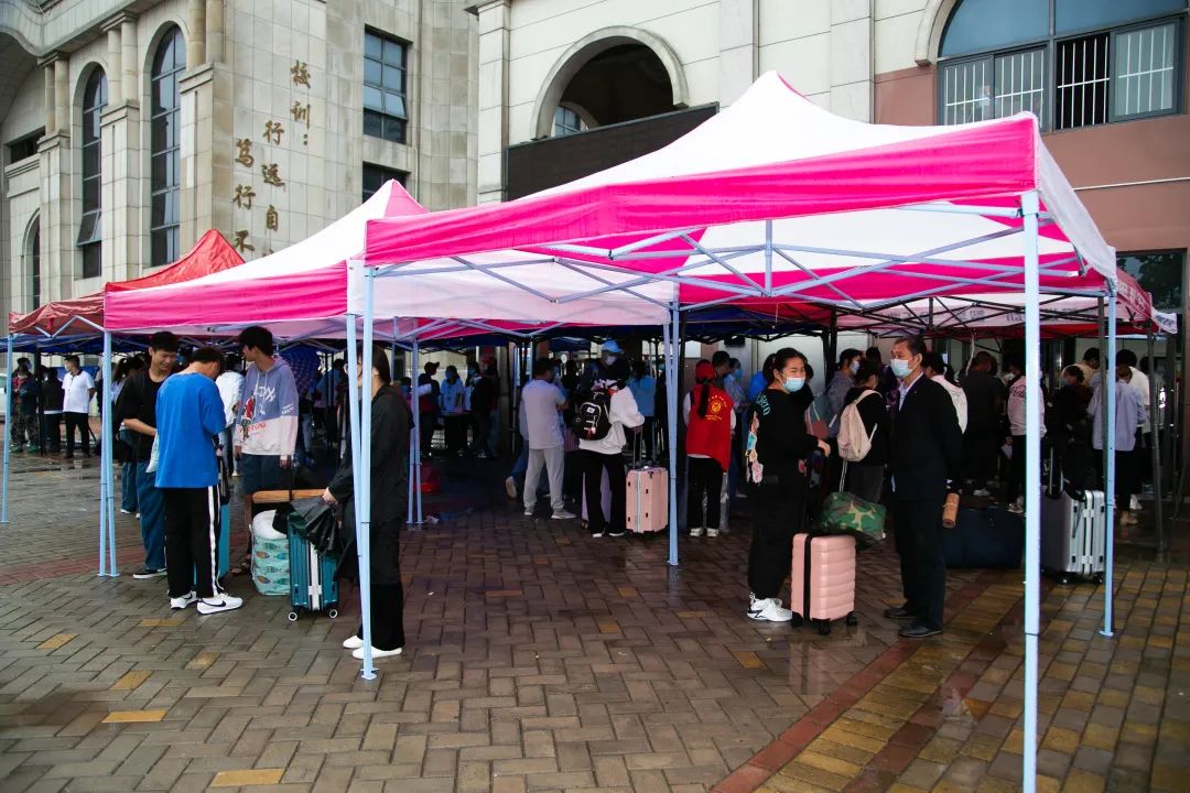 即使天氣微涼,天空中下著小雨,也仍然擋不住學生們期待的心情。校門剛剛打開,學生和家長們就拎著大包小包陸續(xù)到來了。