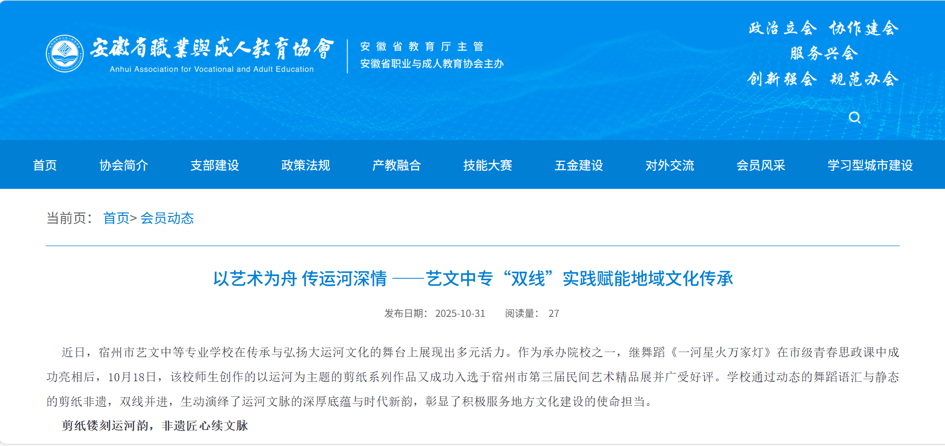 近日,宿州市藝文中等專業(yè)學(xué)校在傳承與弘揚(yáng)大運(yùn)河文化的舞臺上展現(xiàn)出多元活力。作為承辦院校之一,繼舞蹈《一河星火萬家燈》在市級青春思政課中成功亮相后,10月18日,該校師生創(chuàng)作的以運(yùn)河為主題的剪紙系列作品又成功入選于宿州市第三屆民間藝術(shù)精品展并廣受好評。學(xué)校通過動態(tài)的舞蹈語匯與靜態(tài)的剪紙非遺,雙線并進(jìn),生動演繹了運(yùn)河文脈的深厚底蘊(yùn)與時代新韻,彰顯了積極服務(wù)地方文化建設(shè)的使命擔(dān)當(dāng)。