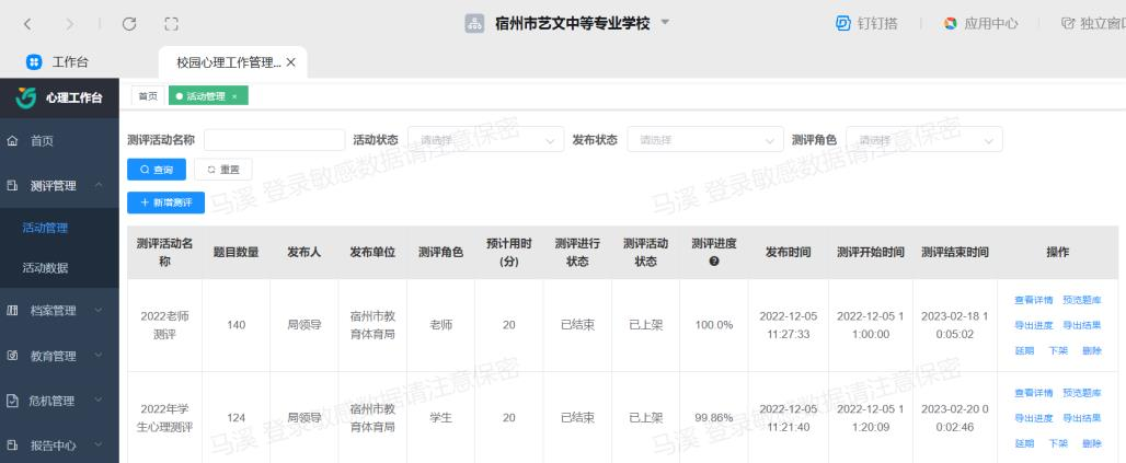 心理篩查工作:開(kāi)學(xué)伊始,各班進(jìn)行了紙質(zhì)心理問(wèn)卷篩查工作,采用的是中學(xué)生心理健康量表,同時(shí)落實(shí)了“一生一案”工作。于12月份又進(jìn)行了全市統(tǒng)一的線上心理測(cè)評(píng),藝文學(xué)校在規(guī)定時(shí)間內(nèi),教師與學(xué)生100%完成。測(cè)評(píng)后的快篩、輔導(dǎo)、上報(bào)工作也及時(shí)完成。