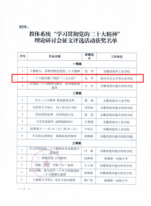 5、在安徽省第六屆校園讀書(shū)創(chuàng)作活動(dòng)“喜迎二十大,奮進(jìn)新征程”主題征文比賽中黃婷指導(dǎo)的作品《我眼中的奧運(yùn)精神》獲得“讀書(shū)創(chuàng)作之星”;指導(dǎo)作品《我眼中的中華魅力》獲得二等獎(jiǎng);指導(dǎo)作品《我眼中的人文中國(guó)》獲得三等獎(jiǎng)。