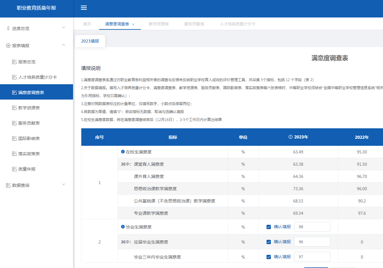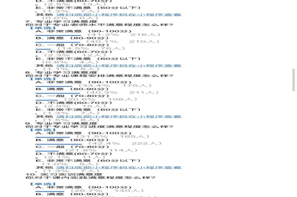 上述4類評(píng)價(jià)的結(jié)果只能作為教學(xué)教育質(zhì)量考核的第一維度,第二維度主要參考滿意度調(diào)查數(shù)據(jù)。即學(xué)校通過(guò)開(kāi)展教職工、學(xué)生、家長(zhǎng)、用人單位滿意度調(diào)查以及師生座談會(huì)等方式,獲得多元主體對(duì)學(xué)校教育教學(xué)質(zhì)量和人才培養(yǎng)質(zhì)量滿意度的相關(guān)數(shù)據(jù)。通過(guò)反饋的數(shù)據(jù),改進(jìn)教育教學(xué)模式,提高教學(xué)質(zhì)量,辦人民滿意的學(xué)校。